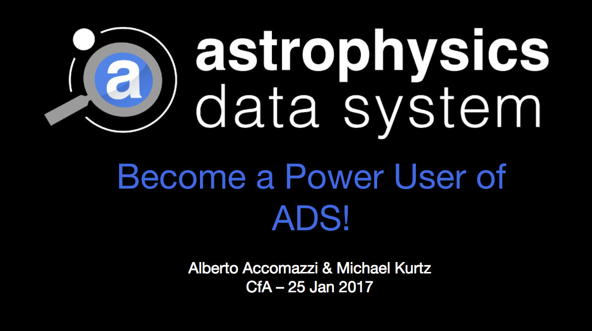 A recording of a tutorial given at the Center for Astrophysics on using the new ADS interface is now available. Hope you enjoy it! Recording of the tutorial (1h 8m) Slides of the presentation Topics covered in this tutorial include:...