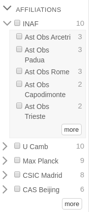 Using one of this blog’s coauthors, searching for first_author:“Templeton, Matthew” brings up a list of his papers along with a few other “Matthew Templeton”s who are active researchers in ADS-relevant fields. Selecting the “astronomy” collection and “limit to” yields (mostly) just his set of first-authored publications, and refereed lowers it further to a manageable number. If you then open the Affiliations facet, you’re presented with a list of all affiliations (of any author) contained within his papers. Matthew Templeton’s historical affiliations – AAVSO, New Mexico State University, Yale University, Los Alamos National Laboratory – are among the most common in the list. However, you also find affiliations of co-authors too, for example Iowa State and the Center for Astrophysics.