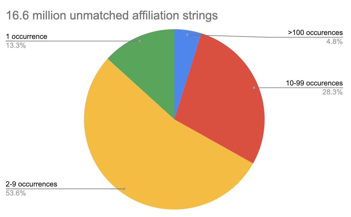 However, we’re getting close to the limit of what we can do with human classification without lots of effort. Our most recent pass through our metadata has just over 4.8 million unique unclassified strings yielding a total of 16.6 million unclassified affiliations. There are about 6000 unclassified affiliations that appear 100 times or more in the metadata and assigning them aff_ids would provide a lot of new information. However, over 65 percent of unclassified affiliations occur fewer than 10 times, and 13 percent of unmatched affiliation strings only appear once in all of our affiliation metadata.