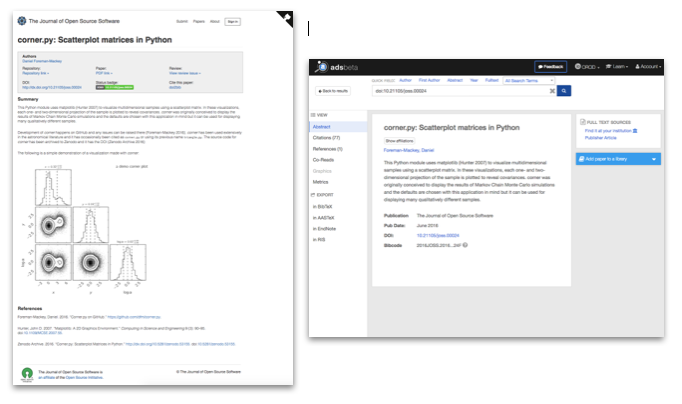 What does all of this mean in practice? Let’s look at an example. The Python module corner.py (previously known as triangle.py) is widely used in astronomy. Its main developer, Daniel Foreman-Mackey, made it available on Github and published an entry in the Journal of Open Source Software (JOSS). The ADS has a record for this JOSS software paper, and as a result citations are being captured (provided people cite this record properly). As of November 9, 2017, this JOSS paper accumulated 77 citations.