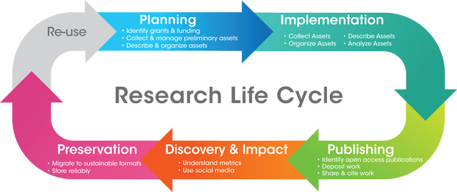 Figure source: "Research Life Cycle" image from UC Irvine [Library Digital Scholarship Services](https://www.lib.uci.edu/dss)