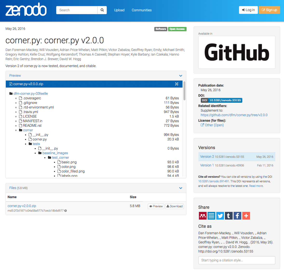 Thanks to Zenodo’s interoperability with Github, records were created for both triangle.py and corner.py. Zenodo mints a DOI for each software version and also a so-called concept DOI. The concept DOI is available for when you don’t want to cite a specific software version, but just “the latest”. The crucial step that make this interoperability possible is the authentication within Zenodo, using your Github account, allowing Zenodo to view and retrieve your repositories on Github. For details, see: https://guides.github.com/activities/citable-code/.