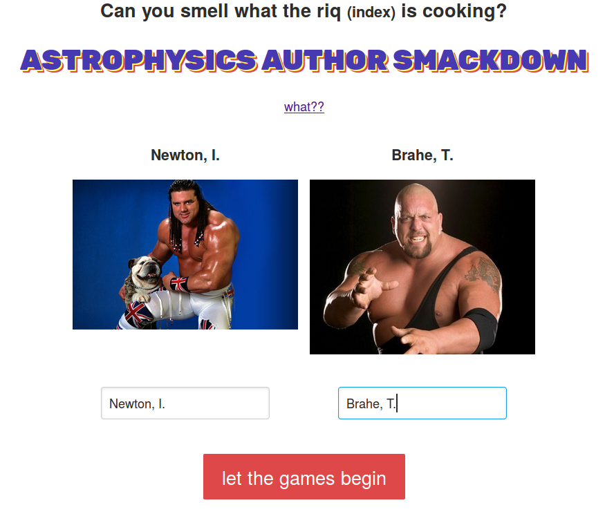 First, we decided to create an application that pits two authors against one another by comparing their publication metrics against each other. Second, apply the 90s-00s WWE/WWF theme.