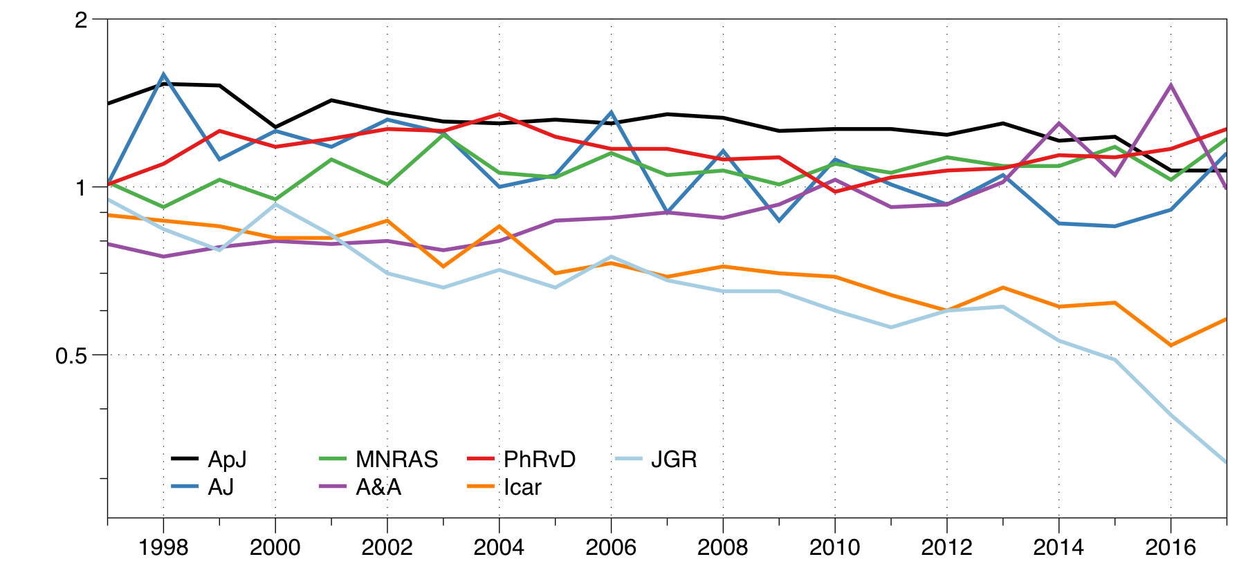 In our blog series we have explored the landscape of astronomy-related refereed scholarly literature. It is important to emphasize this fact, because this selection criterion is less restrictive than using publications defined as astro/planetary. For example, many Earth Sciences papers are related to Planetary Science, but are not strictly Planetary Science papers. We are grateful to Keith Smith for having pointed out that it is crucial to highlight this selection criterion. Our analysis clearly shows the interdisciplinary nature of current astronomy research and also the shifts in publications venues. These shifts have expressed themselves in the levelling of the playing field of journals. This levelling followed from the results shown in the second blog, but it also follows from the perspective offered in this blog.