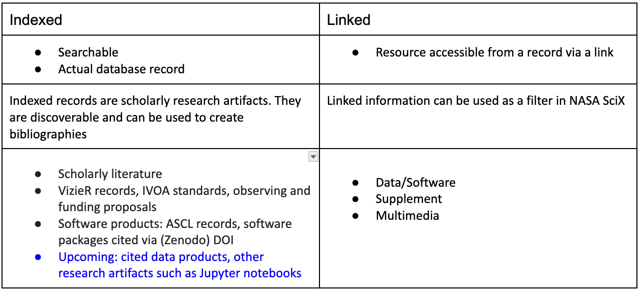 By construction links can, in principle, point to a resource outside of SciX, with the exception of two relationships that represent the following: “citations” and “co-readership”, both of which are only meaningful within SciX context. With this relation both the source and the target must correspond with nodes that lie within the circle in figure 1. The nodes within the circle represent what is indexed in SciX; these are actual, searchable database records, and their metrics (such as citations and reads) are tracked by SciX. Linked resources are not searchable, but they can provide a means for filtering search results. As an example, software packages cited in the literature are indexed records, which means you can use a SciX search to find all packages written by a particular researcher or cited more than N times. On the other hand, data products hosted by NASA archives are linked resources. While you can’t discover them with a search, you can find all the SciX records which link to one or more data products hosted by a particular archive such as MAST, Chandra, or SIMBAD. Table 1 summarizes the differences between indexed and linked information in SciX.