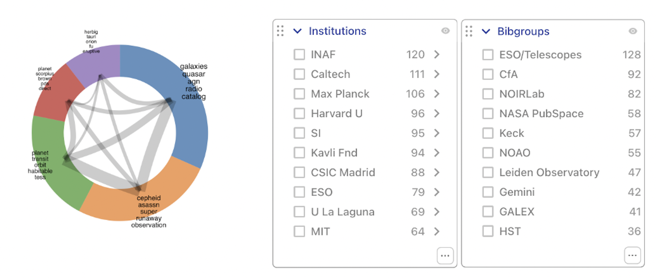 Focusing on the 5,000 most recent VizieR data catalogs, we discover that they have been cited by just under 800 publications; close to 600 of these are Open Access publications with links to data. Figure 4 illustrates the range of topics covered by these publications by creating the Paper Network. The Publications facet for these citations shows that they mostly come from the well-known astronomy publication venues and the Institutions facet (see figure 4, right) indicates that the authors of the citing publications work at a wide range of locations. The citing publications are also represented in many bibliographic groups (“bibgroups”); these are curated lists of publications for institutes, missions or instruments.
