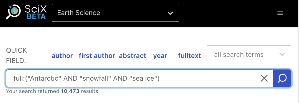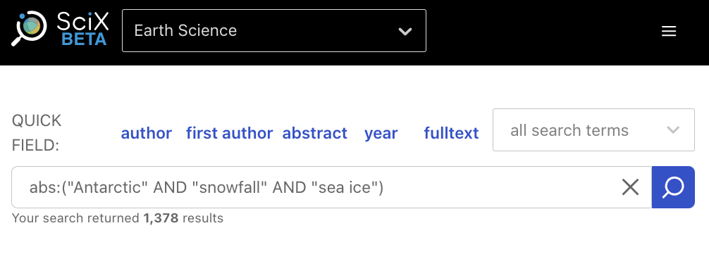 The abs:"" function of SciX can search my keywords in titles and also in the abstract and keywords sections. For example, I can type in the search bar on SciX abs:(“Antarctica” AND “snowfall” AND “sea ice”), and SciX will go through the titles, abstracts, and keywords of records in the corpus to find the most relevant literature for these topics.