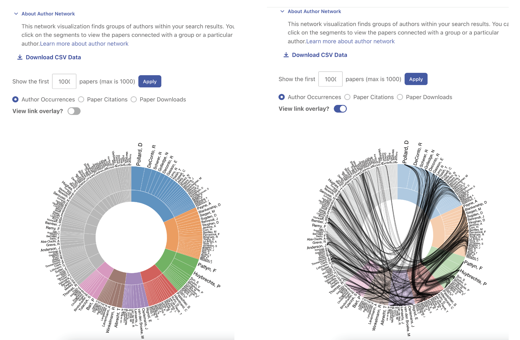My favorite function of SciX has to be their visualization tools for the search results. When I first entered the field, I wanted to identify who was publishing under the topic that I became interested in. The author network visualization generated when I search a certain topic such as “Antarctic Ice Sheet” can show me a color-coded pie-chart of different groups of people who tend to publish together. When I click on the view link overlay option, I can see the authorship collaborations between different groups. This is helpful for me to find out who is publishing often in the group and who collaborates with particular authors. This function can be very helpful when you are applying for graduate school to identify the big contributors in the field. The author network is also a powerful tool when you are trying to find collaborators in a field that you are not familiar with.