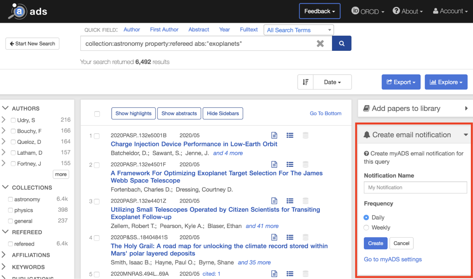 These alerts cover many of the typical use cases, but the new myADS is ready to unleash the full ADS potential by allowing fully customizable notifications. Now, any valid ADS search query can be converted into a daily or weekly notification.