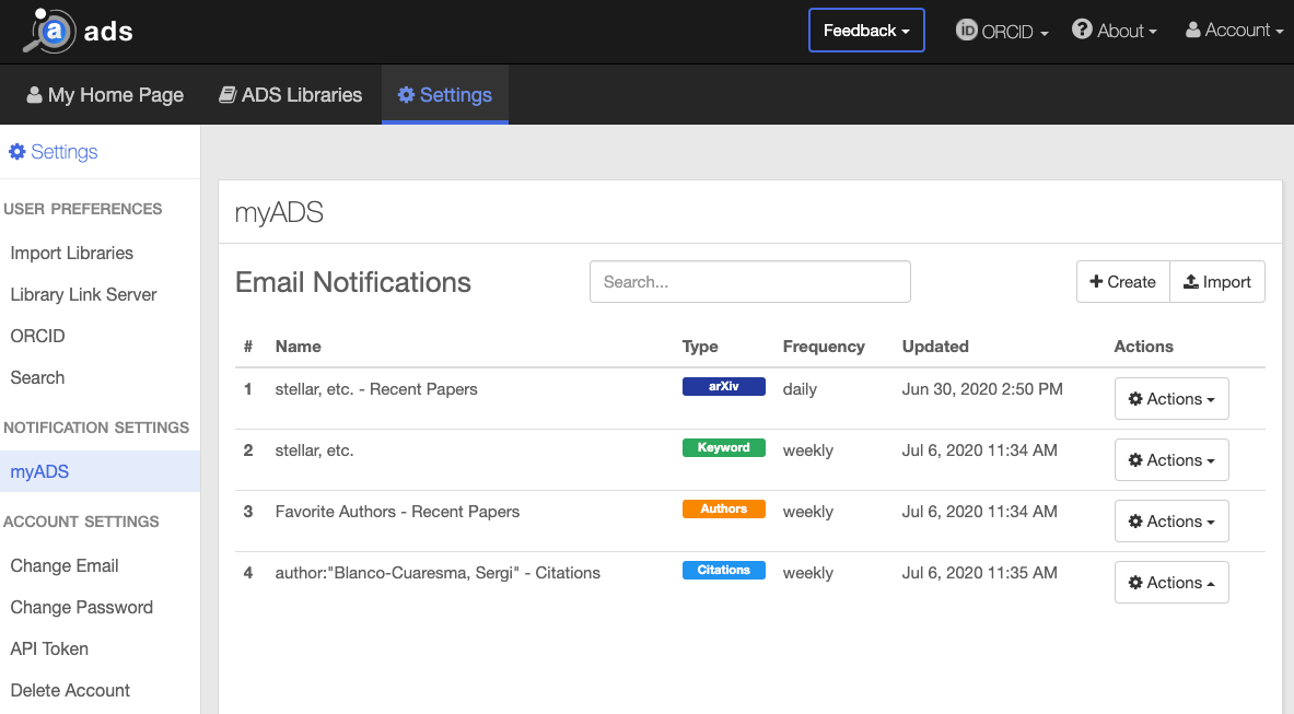 Notification emails from the classic myADS service were disabled on July 11, so now is the time to learn how to create your own myADS email notifications to stay on top of the latest news in your field with ADS! And as always, if you’d like to share any feedback about the new service, do not hesitate to drop us a line or tweet us @adsabs.