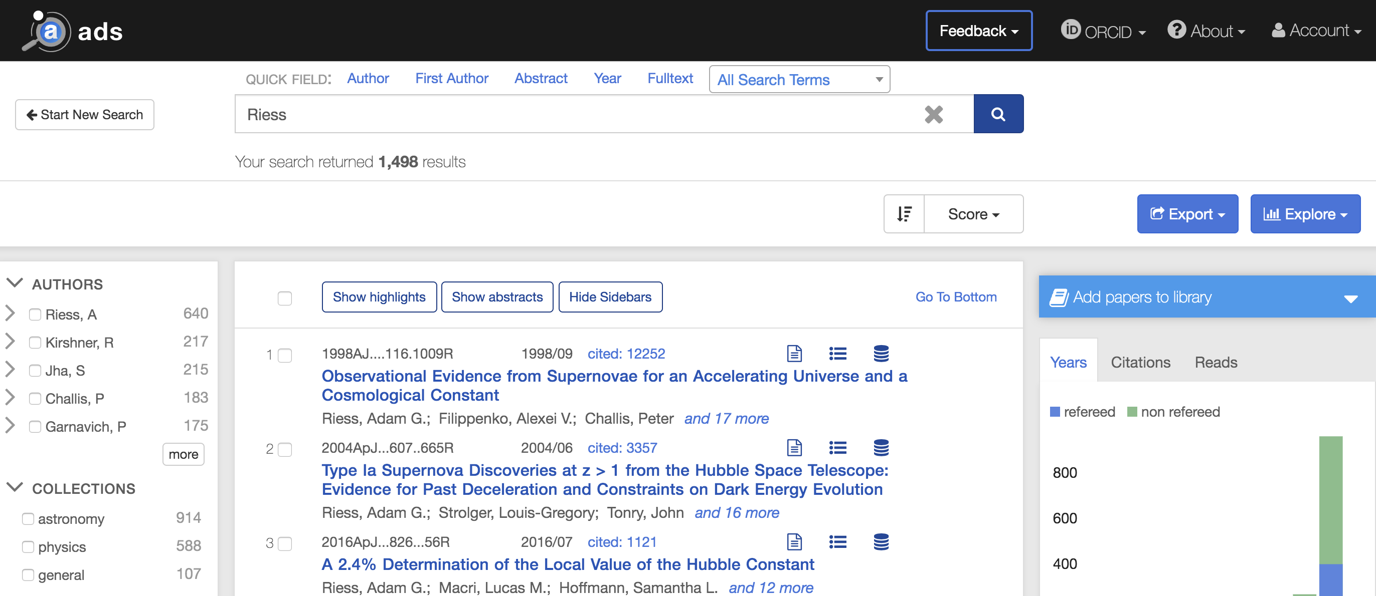 A search for Nobel Prize-winning astronomer Adam Riess shows the difference. Searching by his last name and sorting by date (Riess) returns the most recent papers first; some of these likely cite him in the abstract, include him or someone with the same name as Nth author, or otherwise mention his name in passing. Changing the sort to score order (Riess), however, returns his Nobel Prize-winning papers, and other highly cited works, at the top of the list.