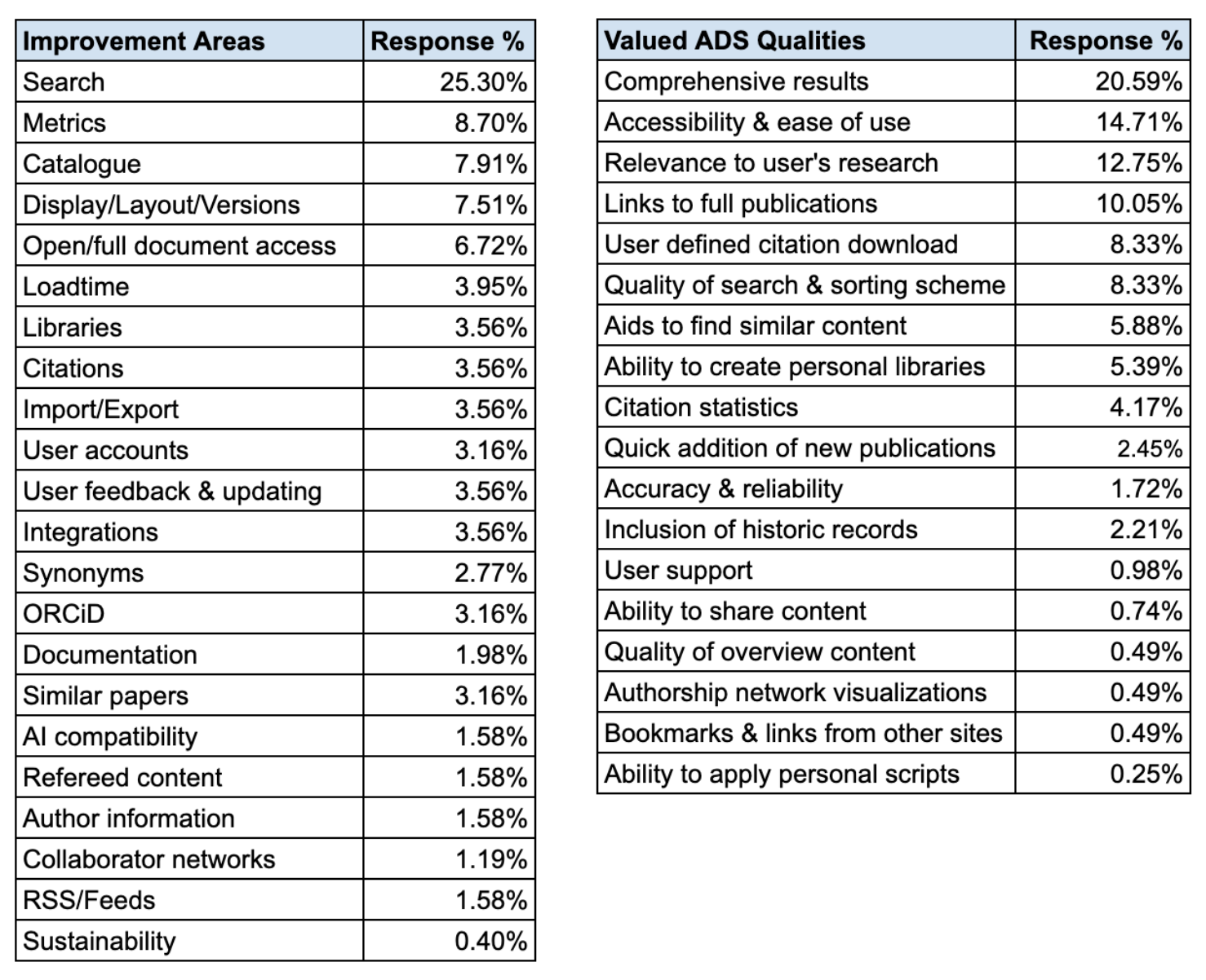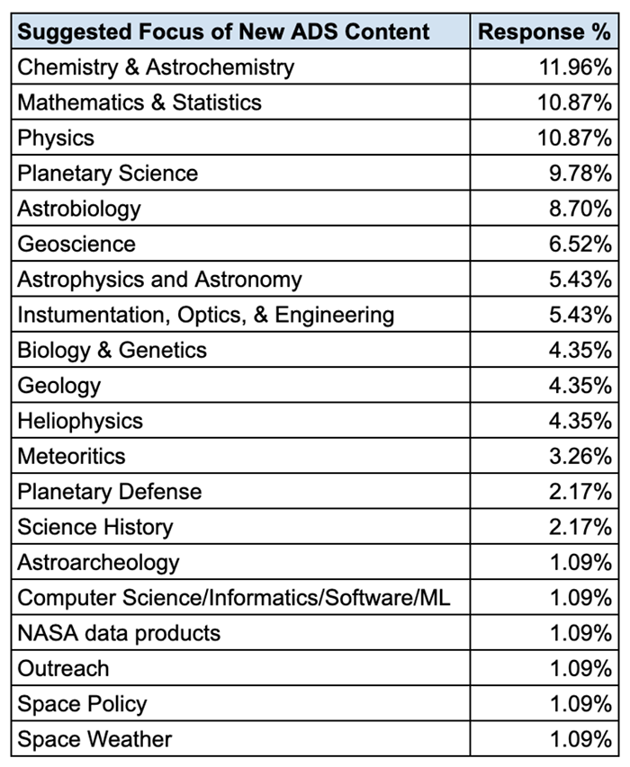 Figure 6: % of user survey responses requesting expansion of ADS & SciX to include additional content in these subject areas.