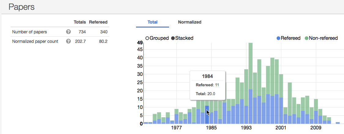 Use this panel as a sanity check that your search is selecting the publications you are interested in, since all of the indices are calculated based on this set. On the left side of the panel, the total number of publications and the number of those which are refereed are listed. On the histogram, you can mouse over any data point to see the actual values. The first result set is for the default amount of publications (300). If you have more, you can specify that number in the box at the top of the overview (up to the maximum of 2,000). We expect to be able to increase this maximum at some point in the future.