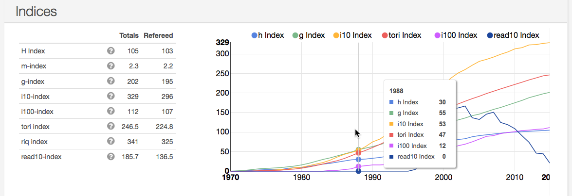 There are panels that display information about Citations and Reads, but let’s focus on the Indices. The panel illustrates the values of various indices on any given year.